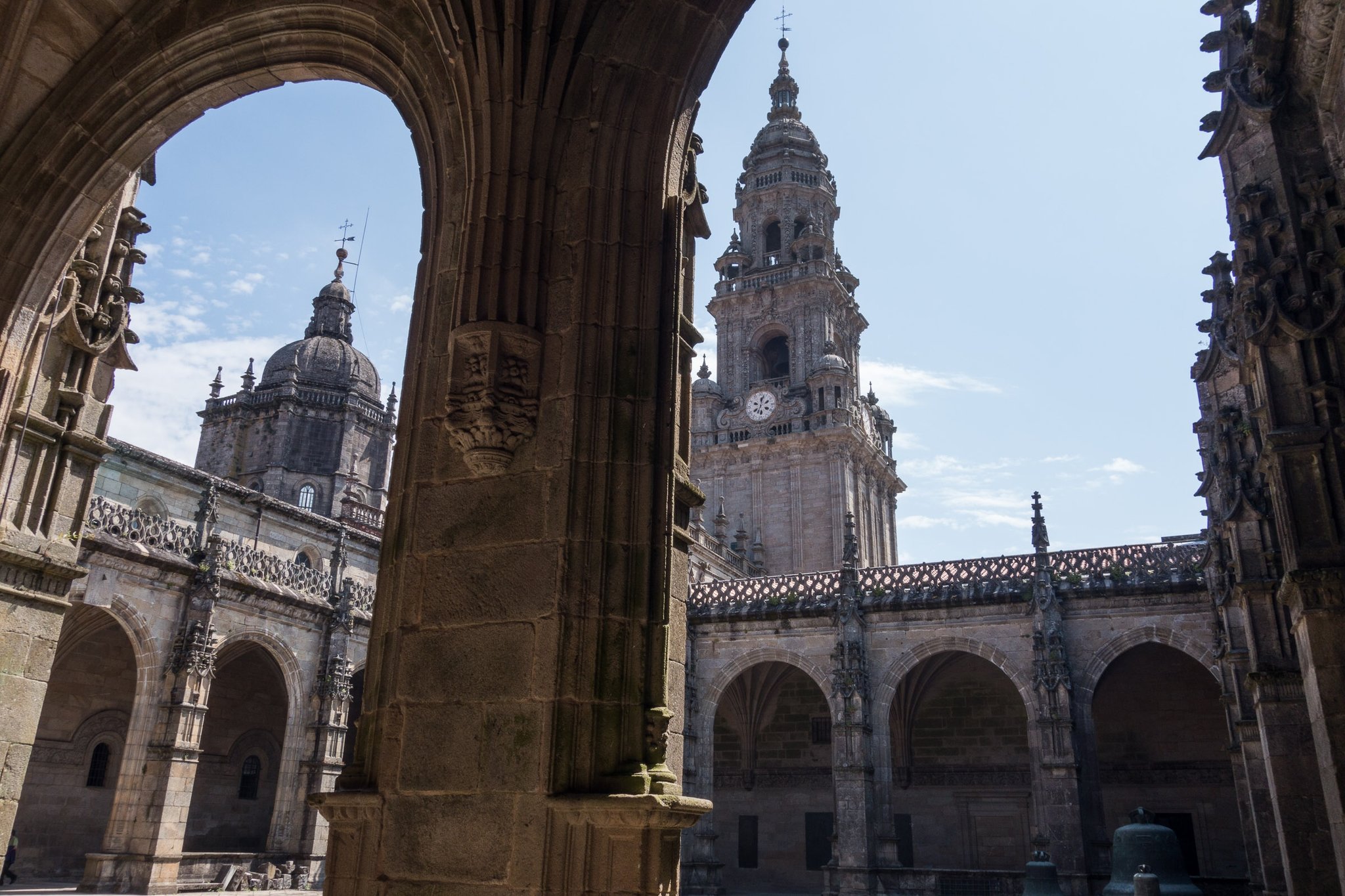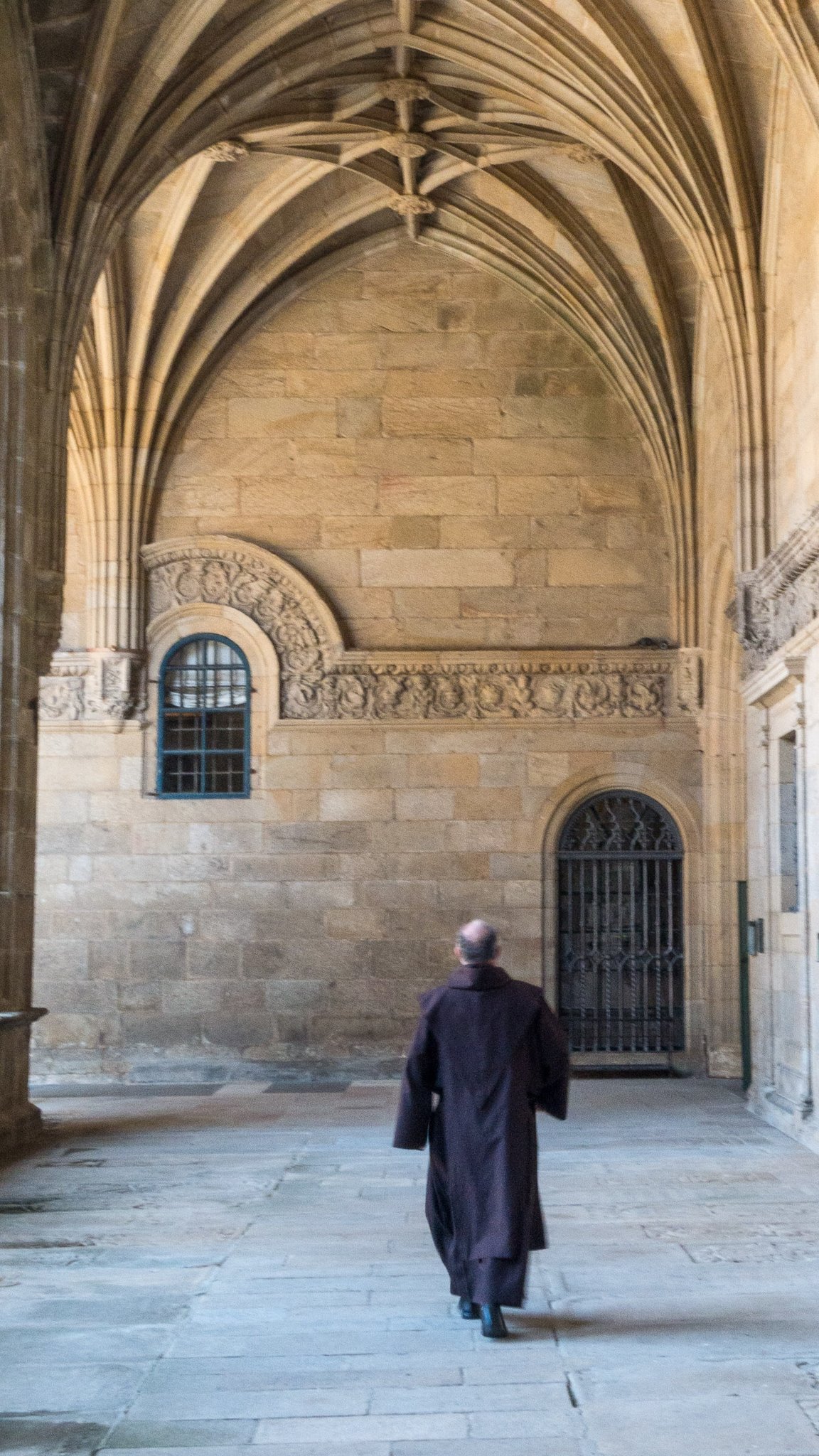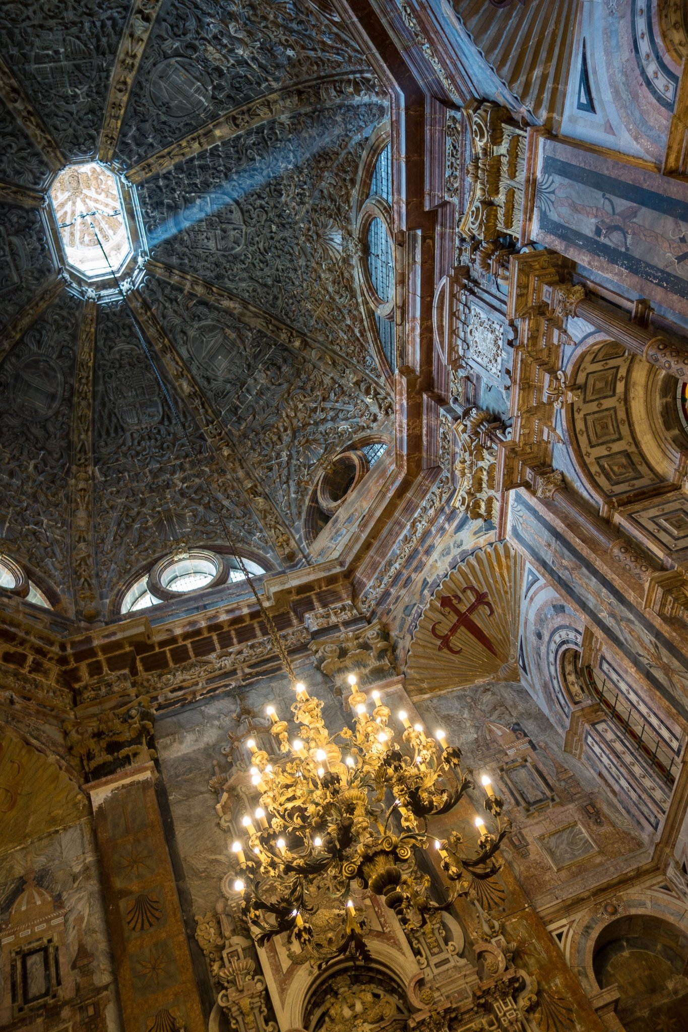 We attended the pilgrim's Mass the next day, and what an experience it was! Although I didn't understand what was being said, the spectacle of the space, the organ music and singing, the shafts of light through vaulted windows, the hundreds of pilgrims, all combined to be a powerful experience. The Mass culminated in the swinging of the botafumeiro filled with burning incense. It is suspended from a pulley mechanism in the dome on the roof of the church. The current pulley mechanism was installed in 1604 and the tradition dates back to the 11th century. The rope is pulled by 8 tiraboleiros in red robes building speed until it gets nearly horizontal above the pilgrims 21 meters below. The burning incense was intended to mask the smell of the unwashed pilgrims, but also provides a dramatic conclusion to the service.