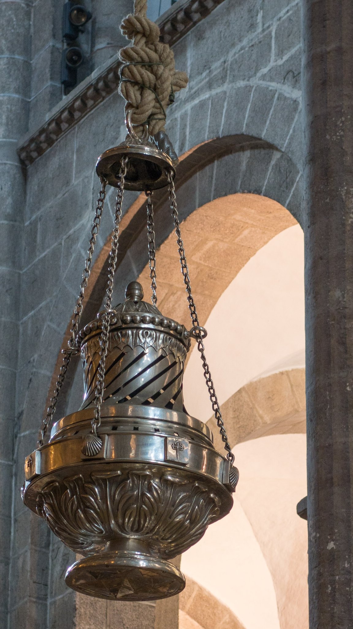 We attended the pilgrim's Mass the next day, and what an experience it was! Although I didn't understand what was being said, the spectacle of the space, the organ music and singing, the shafts of light through vaulted windows, the hundreds of pilgrims, all combined to be a powerful experience. The Mass culminated in the swinging of the botafumeiro filled with burning incense. It is suspended from a pulley mechanism in the dome on the roof of the church. The current pulley mechanism was installed in 1604 and the tradition dates back to the 11th century. The rope is pulled by 8 tiraboleiros in red robes building speed until it gets nearly horizontal above the pilgrims 21 meters below. The burning incense was intended to mask the smell of the unwashed pilgrims, but also provides a dramatic conclusion to the service.